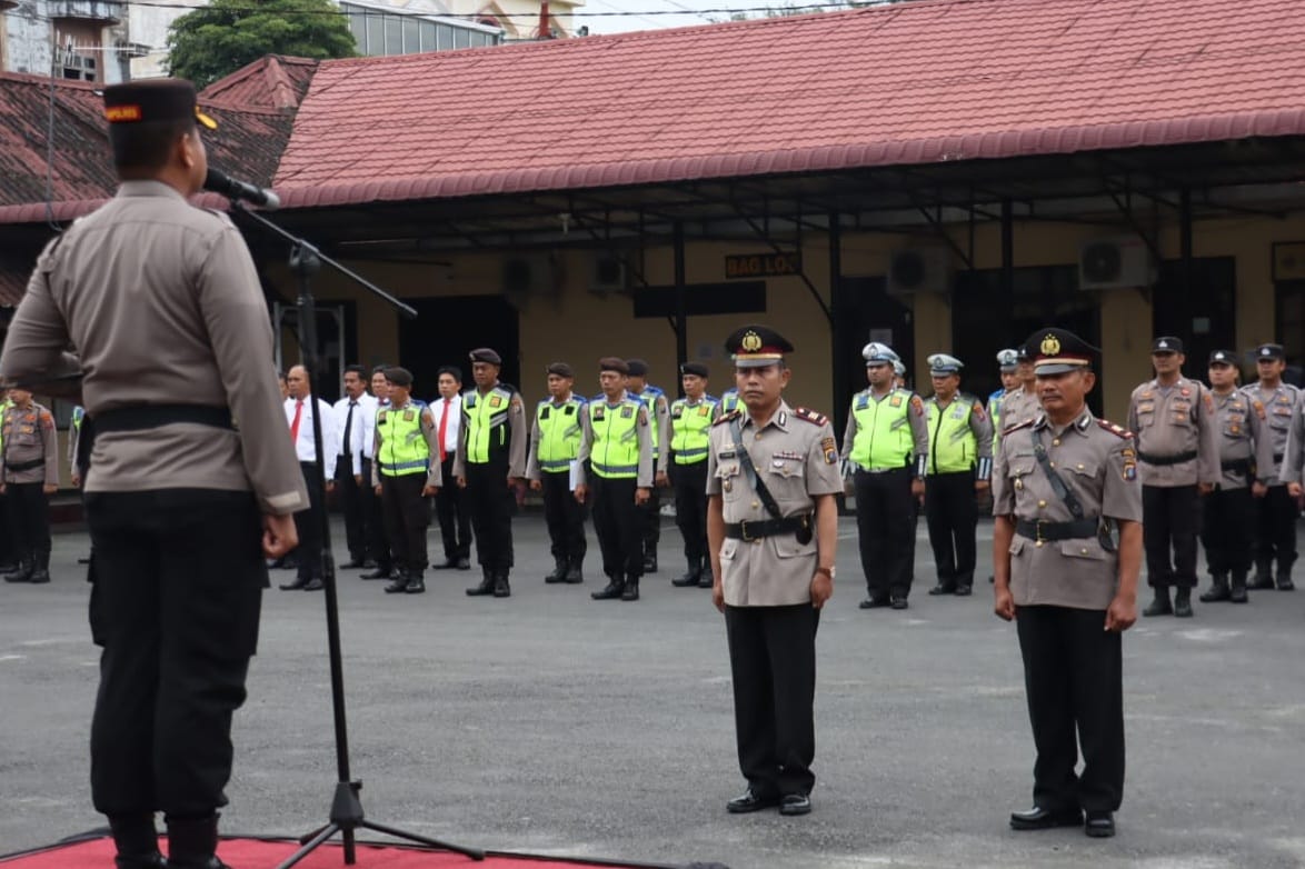 Upacara sertijab Kapolsek Rambutan di halaman Mapolres Tebingtinggi, Selasa (10/1).(RIDWAN/PosmetroMedan.com)