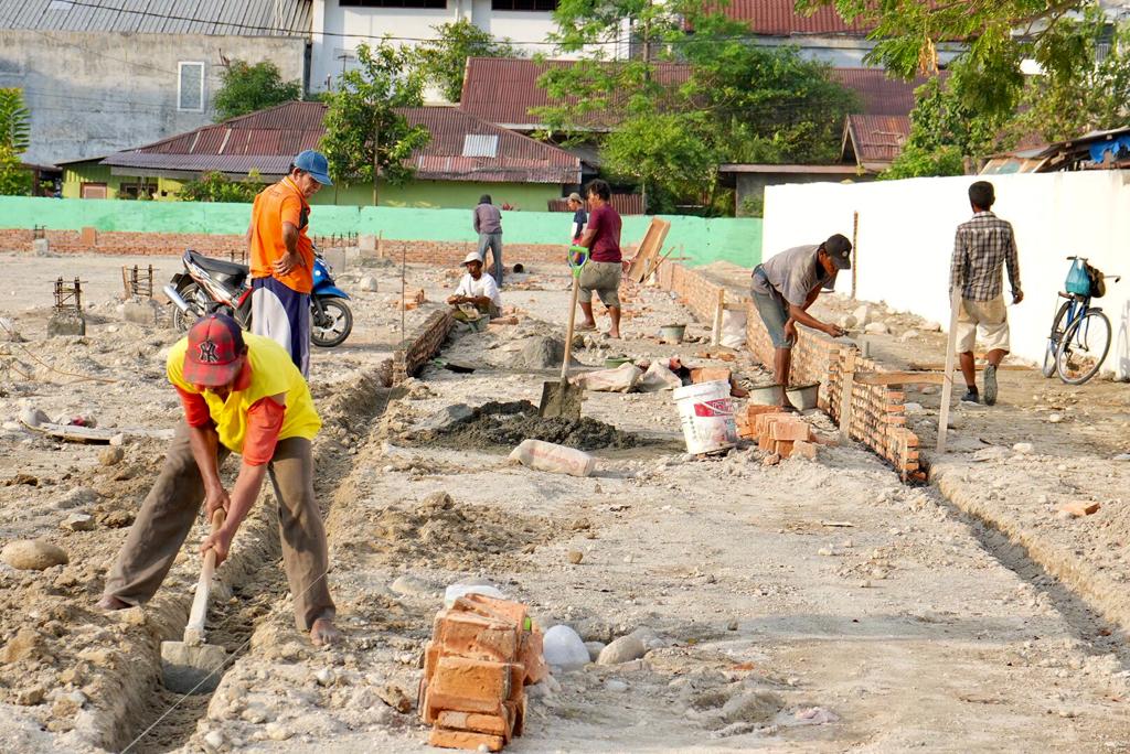Sejumlah pekerja sedang memperbaiki Lapangan Gajah Mada di Jalan Gunung Krakatau, Kelurahan Pulo Brayan Darat I, Kecamatan Medan Timur dengan dana CSR. (Ali Amrizal/Posmetromedancom)