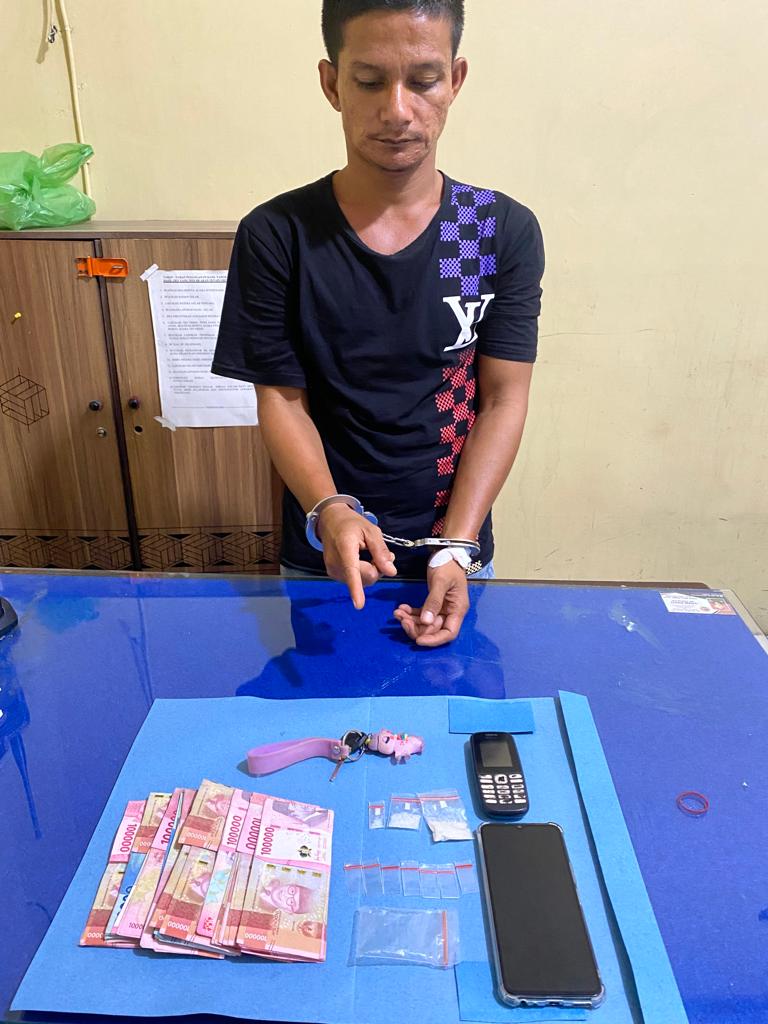 Sementara barang bukti yang berhasil diamankan dari tersangka adalah, 1 bungkus plastik sedang klip transparan diduga berisi sabu dengan berat kotor 2,13  gram; 1 bungkus plastik kecil klip transparan diduga  sabu dengan berat kotor 1,11 gram; 1 bungkus plastik kecil klip transparan diduga berisi sabu dengan berat kotor 0,15 gram; 7 bungkus plastik kecil klip transparan kosong; 1 bungkus plastik sedang klip transparan kosong; uang tunai Rp 8.000.000; 1 unit Handphone merk Nokia warna hitam; 1 unit Handphone merk Vivo warna biru dan 1 unit Sepeda Motor KLX tanpa plat warna biru putih hitam.