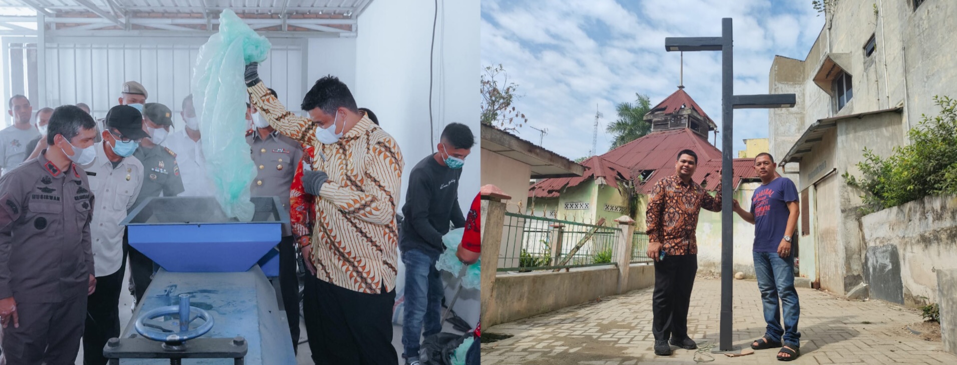 Camat Medan Belawan Subhan Fajri Harahap bersama Pengusaha yang menggagas pusat daur ulang plastik Tom Nauli Sinaga ketika ditemui, Kamis (20/7) di pusat daur ulang memperlihatkan hasil produksi tiang lampu taman. Berdasarkan
