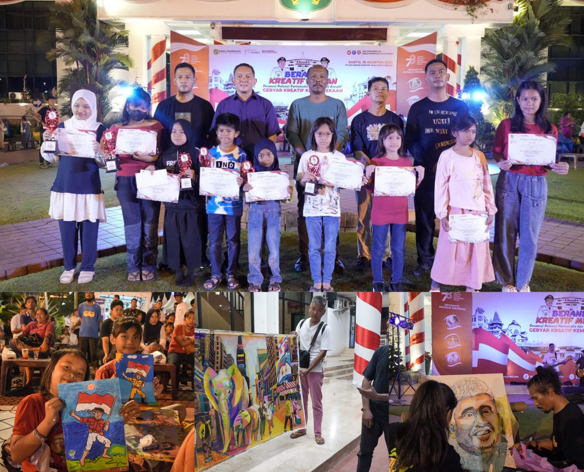 Posmetromedan.com – Aksi melukis berbahan limbah plastik Edi Suranta Ginting serta kanak-kanak yang mengikuti lomba mewarnai menyemarakkan perhelatan Beranda Kreatif Medan, Sabtu (19/8) di halaman depan kantor Wali Kota Medan. Seperti tak ingin kalah dengan Edi yang mengekplorasi warna-dari setiap limbah plastik asoi, bocah-bocah itu juga begitu berani “memainkan” crayonnya.