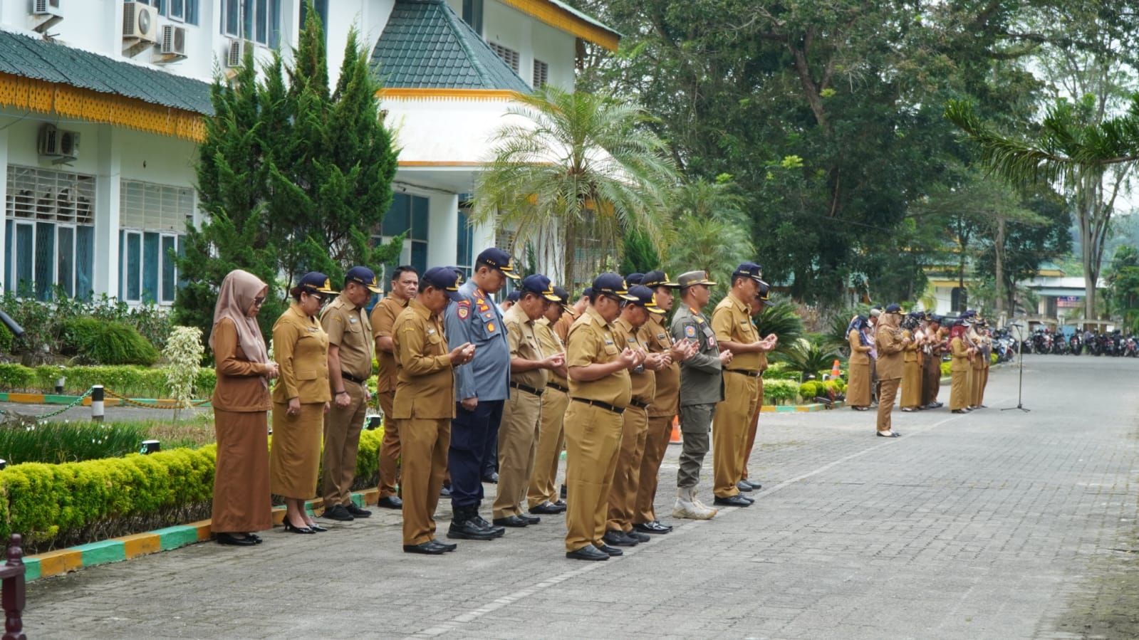 Doa dipanjatkan pada penutupan Apel Gabungan jajaran Pemkab Langkat, dipimpin Kadis Koperasi Langkat, Syahrizal di halaman Kantor Bupati Langkat, Stabat, Senin (6/11/2023).