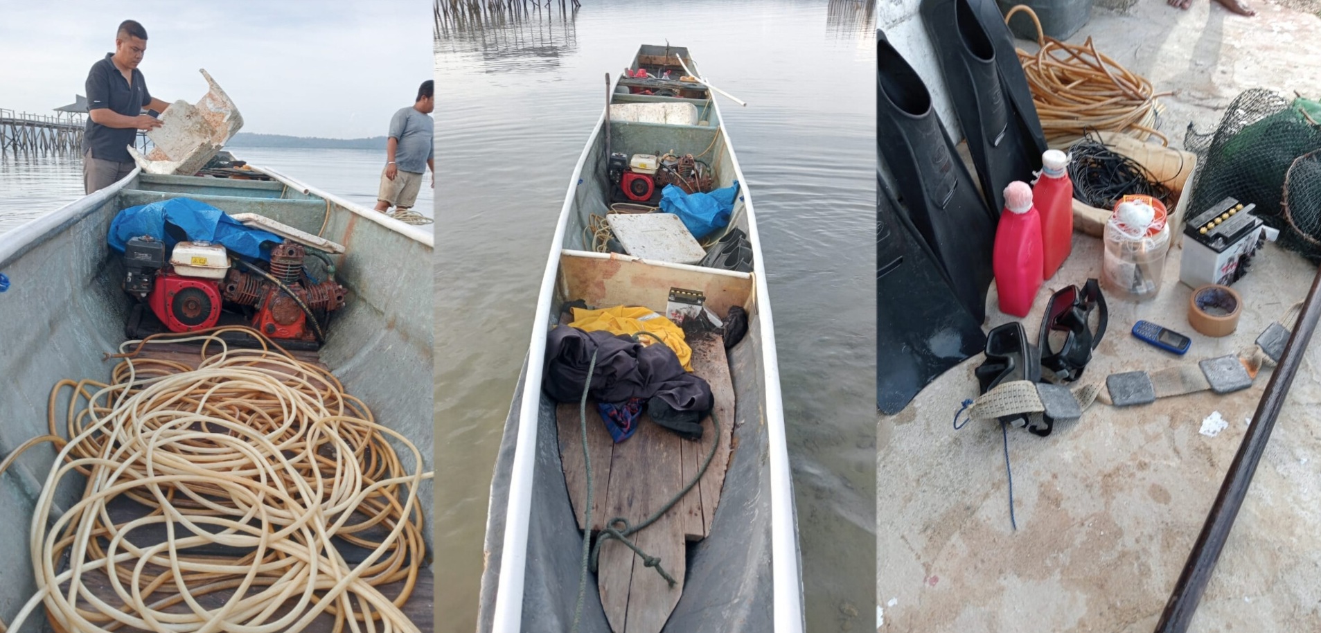 Lalu, dua gulung alat selang penyelam, 4 buah sendok ikan (bundre), satu buah mesin Ts merk Radin 30 pk, tiga batang es balok, dua buah kacamata selam, 4 biji timah sebagai pemberat saat menyelam, dan satu buah alat dayung.