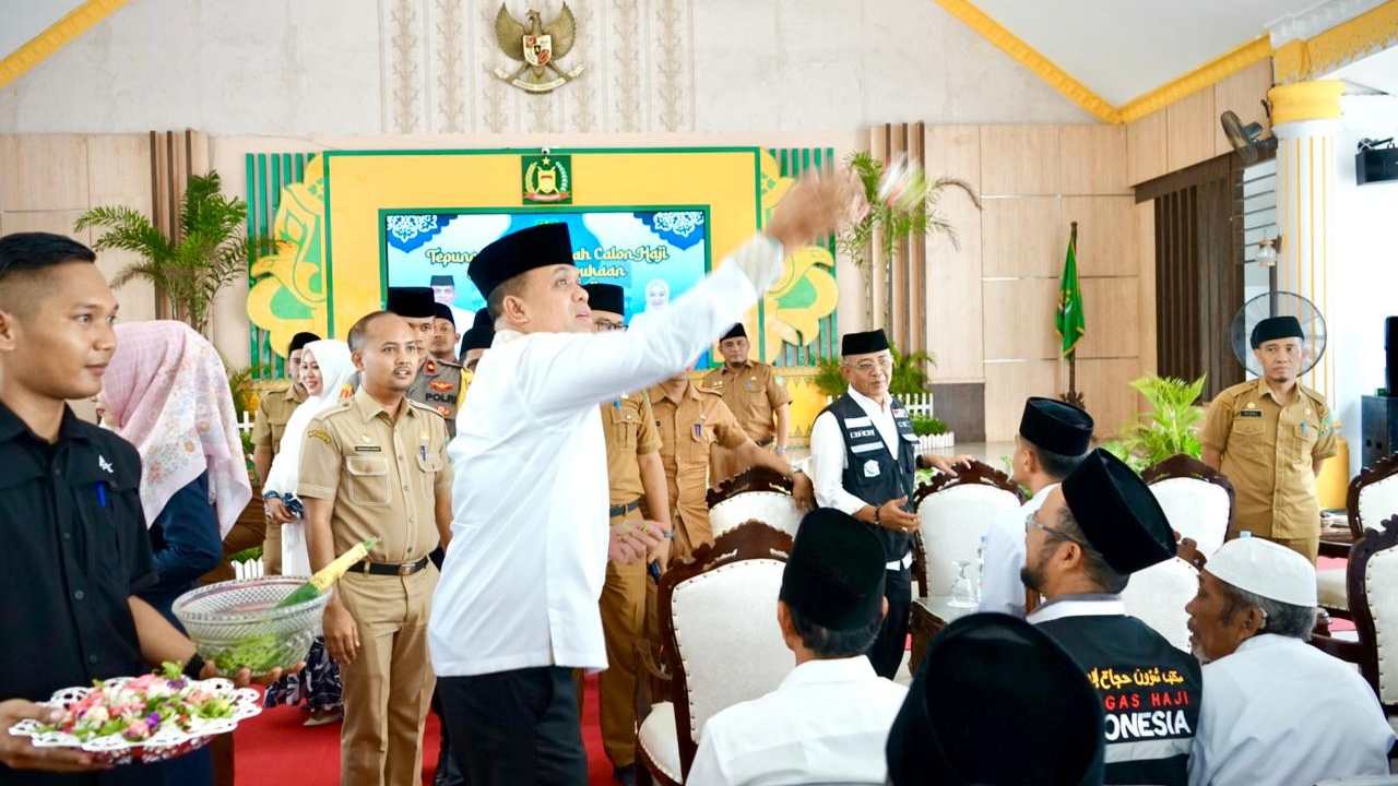 Prosesi jamaah calon haji ditepung tawari Pj Bupati Langkat M Faisal Hasrimy, Selasa (7/5/24) di Pendopo Jentera Malay Rumah Dinas Bupati Langkat. (Posmetro)