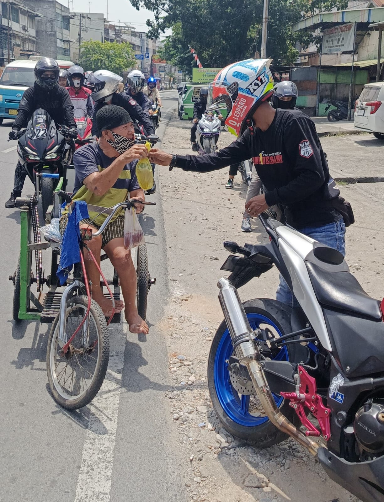Tidak hanya menebar pesan #cari_aman dengan mengedepankan keselamatan saat berkendara dengan motor di jalan, namun satu persatu bikers CBR Riders Medan menhgampiri masyarakat kurang mampu seperti halnya tukang becak, penyandang disabilitas, pengumpul barang bekas, pedagang asongan, untuk menyerahkan paket makan siang yang diharapkan dapat membawa keberkahan bagi sesama.
