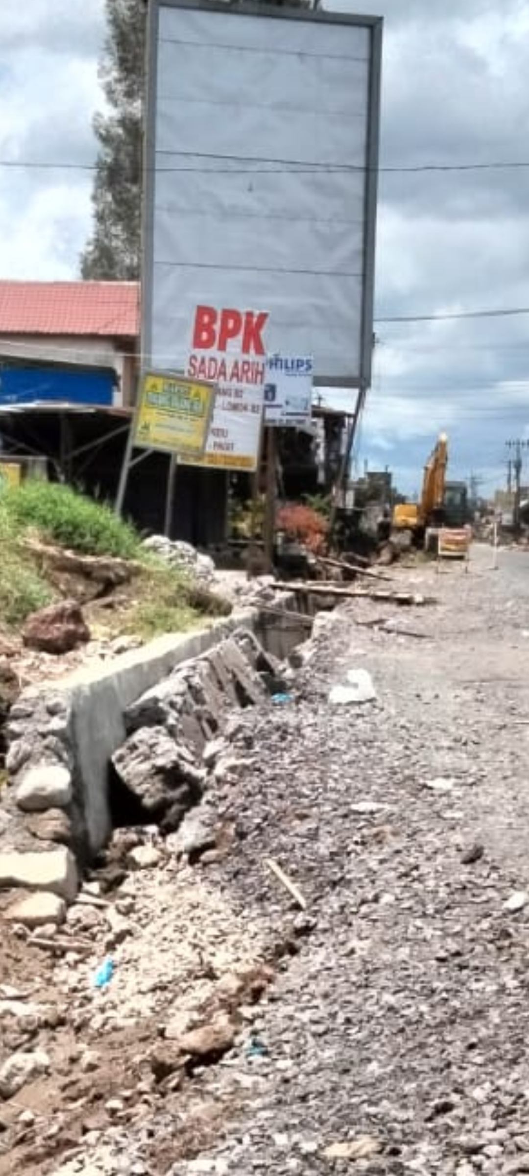 Selain itu batu yang di pasang untuk drainase saluran tampungan air hujan terlalu besar sehingga sangat diragukan daya tahannya untuk ukuran jalan nasional yang sering dilalui mobil bertonase berat