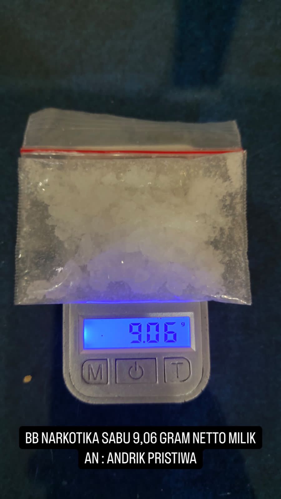 Namun, seorang pria lagi melarikan diri. Petugas kemudian melakukan penggeledahan dan ditemukan barang bukti 1 paket plastik klip diduga berisi narkotika sabu dilipat uang Rp 1.000,- seberat 9,06 gram yang disembunyikan di saku celana depan sebelah kanan.