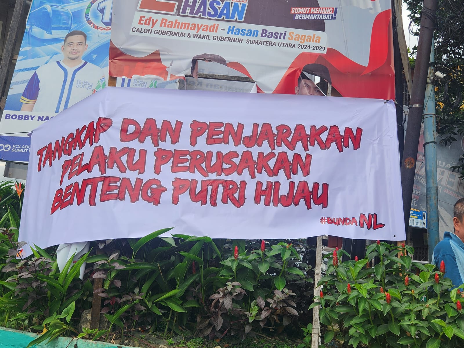 Spanduk itu terpasang di depan baliho Calon Gubernur Sumatera Utara Edy Rahmayadi dan Wakil Gubernur Sumatera Utara Hasan Basri Sagala. Di sekitar lokasi ada juga baliho Calon Gubernur Sumatera Utara Bobby Nasution dan Wakil Gubernur Sumatera Utara Surya.