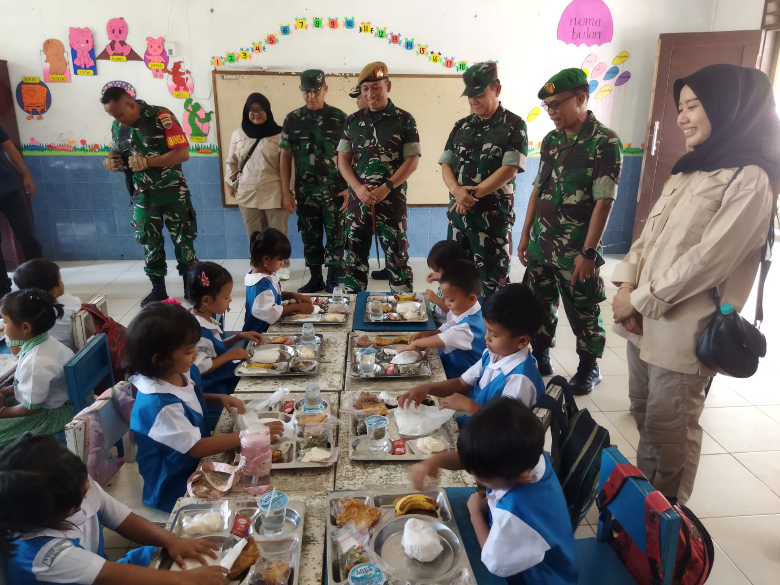 Dam I/BB dan Pers Bekangdam dan Babinsa 04/ SBB membantu Kesiapan Makan Siang Bagi Murid SD dan TK di Dalam Ruang Kelas.