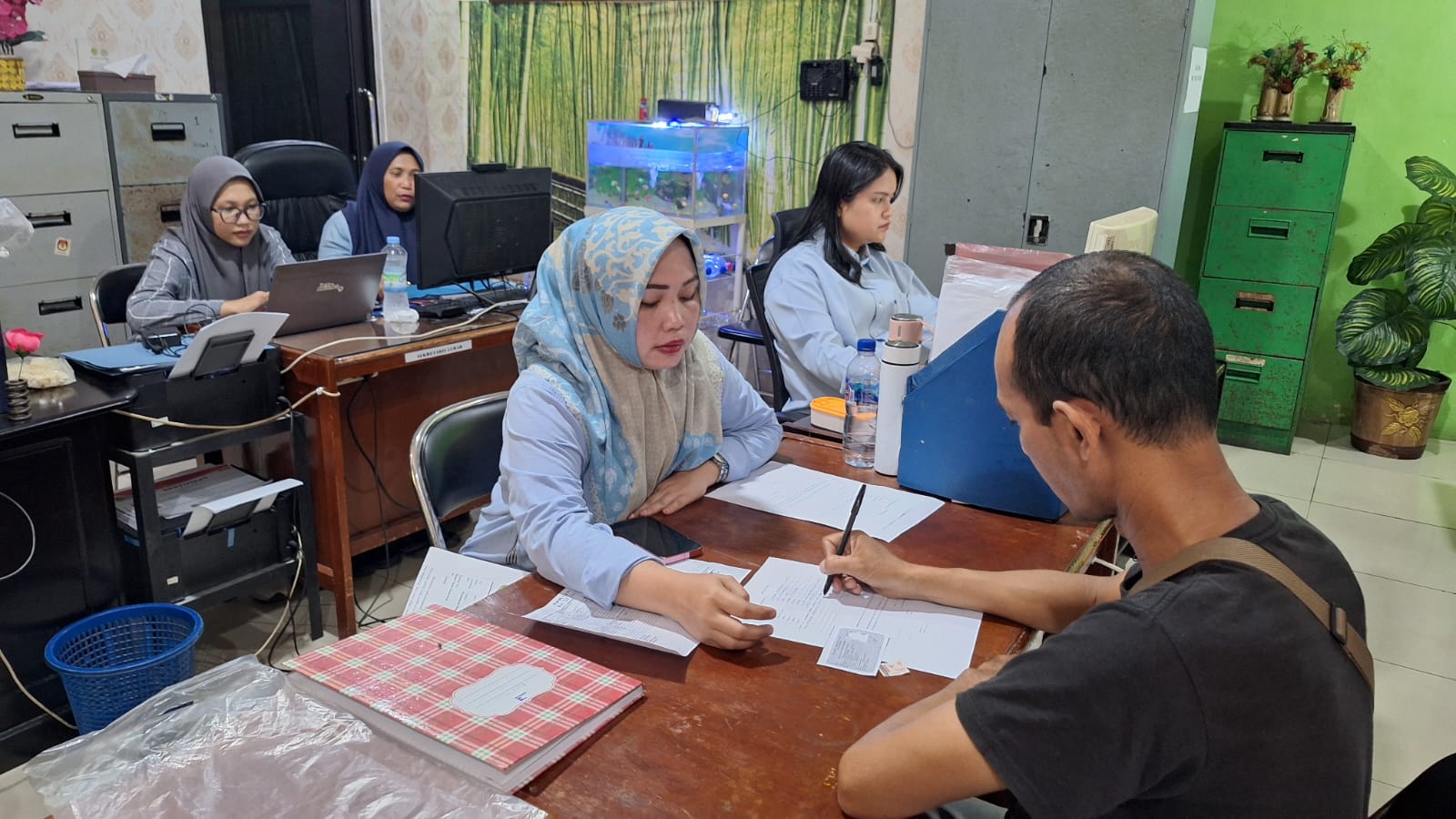 Petugas saat melayani warga yang mengurus adminduk di kantor Kelurahan Teladan Barat.