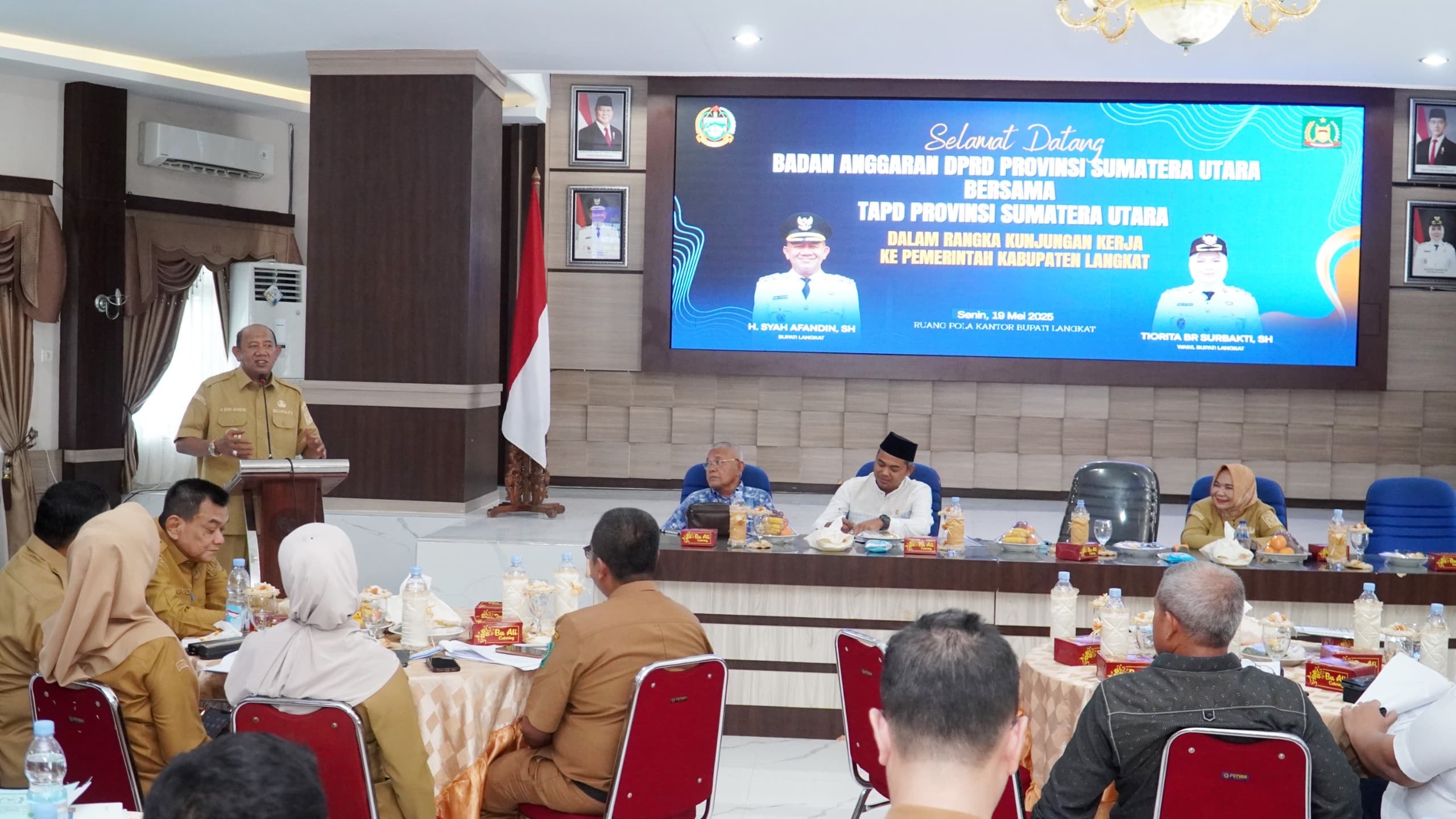 POSMETROMEDAN.com- Bupati Langkat Syah Afandin bersama Wakilnya Tiorita Br Surbakti menerima kunjungan kerja Badan Anggaran (Banggar) DPRD dan Tim Anggaran Pemerintah Daerah (TAPD) Provinsi Sumatera Utara, di ruang pola Kantor Bupati Langkat, Senin (19/5/2025).