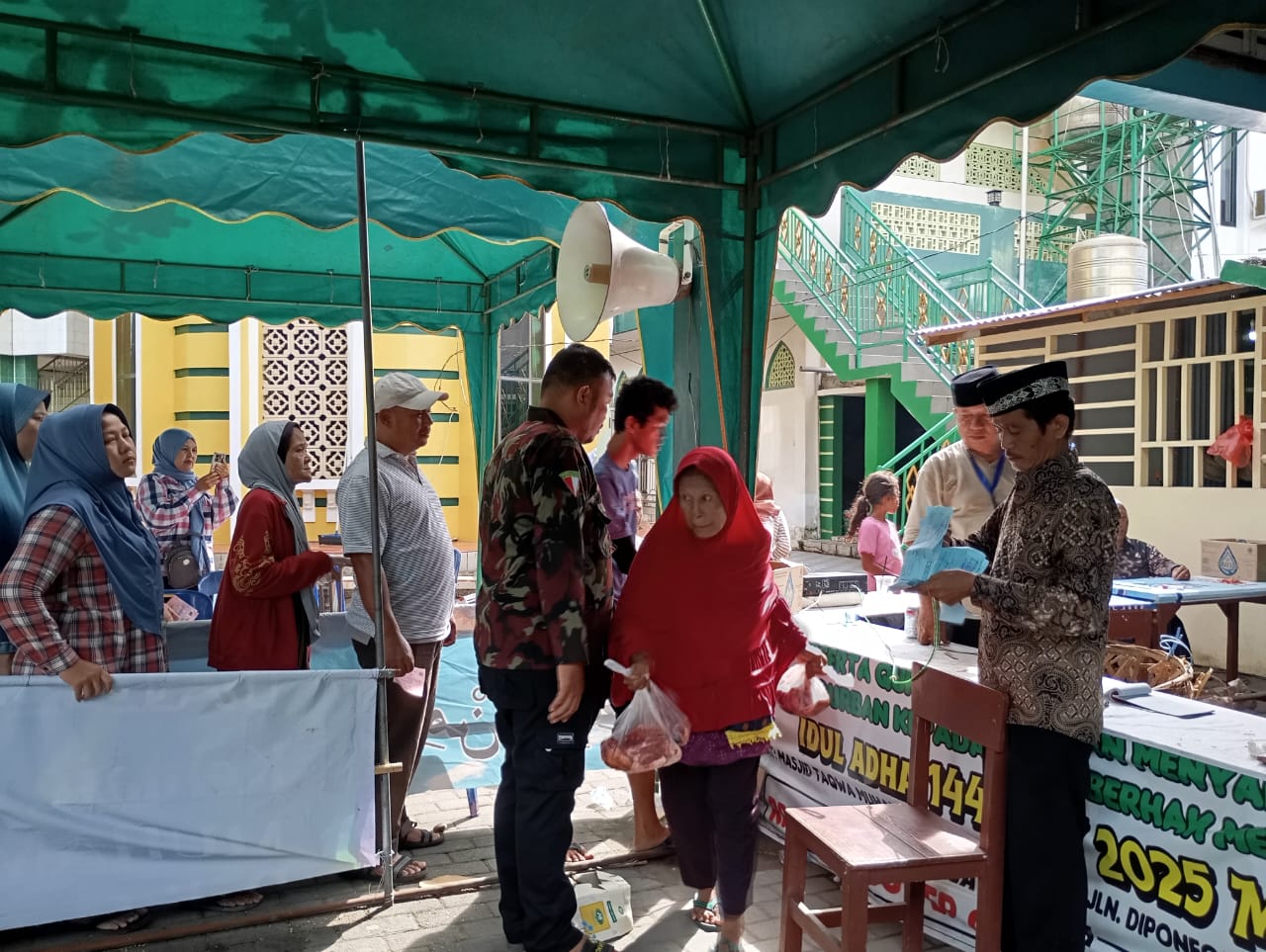 Lokasi pemotongan hewan qurban Idul Adha 1446 H dilaksanakan dihalaman masjid Muhammadiyah Lubuk Pakam. Ratusan warga tampak mengantri dengan tertip menerima daging qurban yang dibagikan oleh panitia. ( Wan)