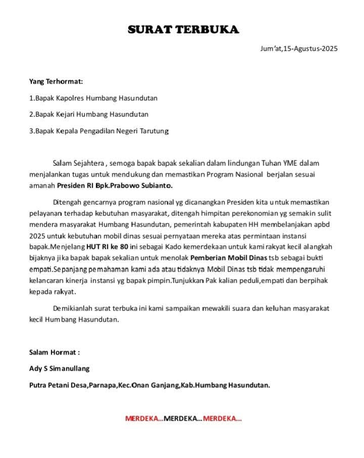 Dituliskan dalam surat itu, agar ditengah HUT RI ke 80 tahun ini, dia sebagai masyarakat kecil agar di hari kemerdekaan ini sebagai kado kemerdekaan, meminta Kapolres Humbahas, Kejari Humbahas, Ketua Pengadilan Negeri (PN) Tarutung , bijaksana dan mempunyai empati untuk menolak pemberian mobil dinasi baru.