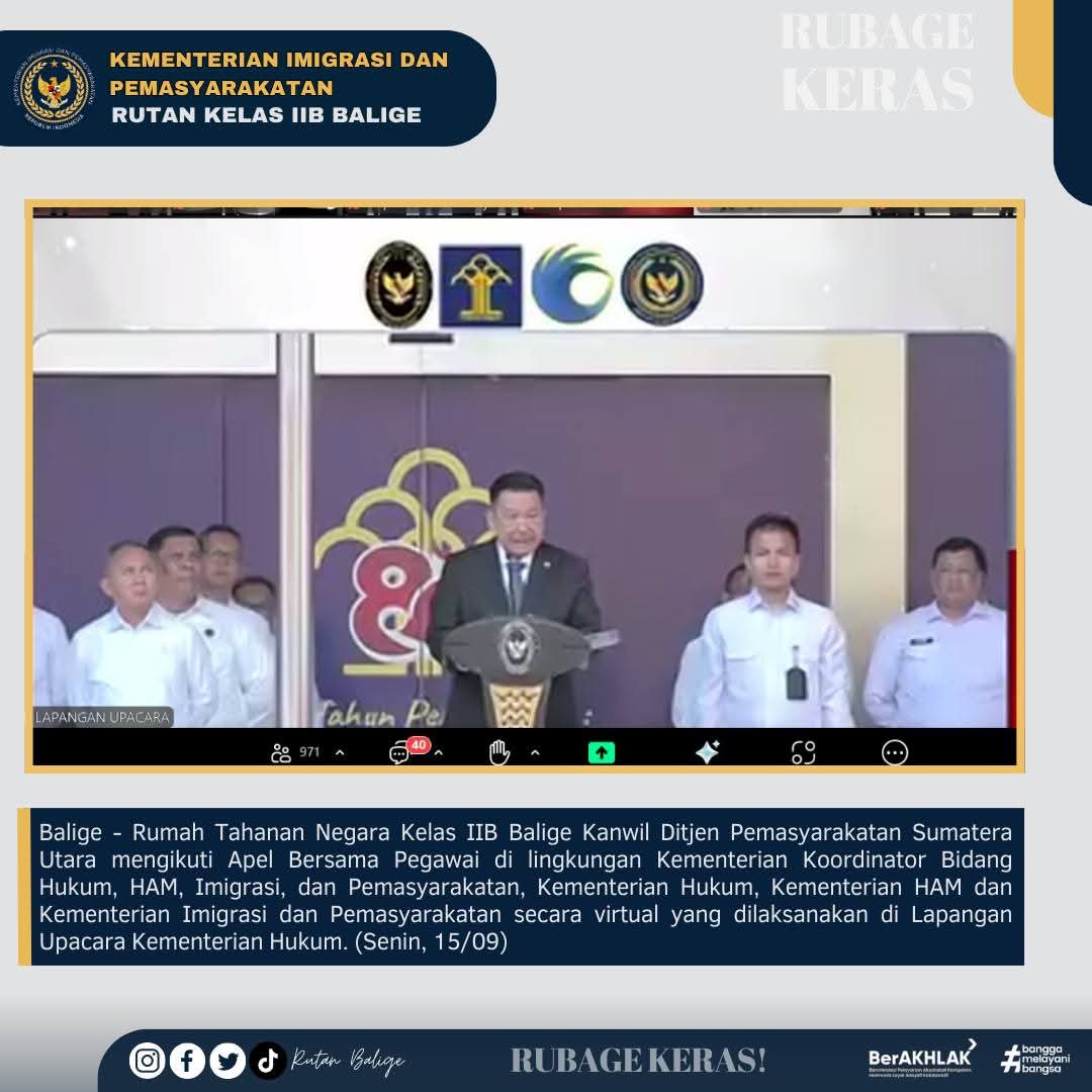 POSMETRO MEDAN – Rumah Tahanan Negara Kelas IIB Balige Kanwil Ditjen Pemasyarakatan Sumatera Utara mengikuti Apel Bersama Pegawai di lingkungan Kementerian Koordinator Bidang Hukum, HAM, Imigrasi, dan Pemasyarakatan, Kementerian Hukum, Kementerian HAM dan Kementerian Imigrasi dan Pemasyarakatan secara virtual yang dilaksanakan di Lapangan Upacara Kementerian Hukum. (Senin, 15/09)