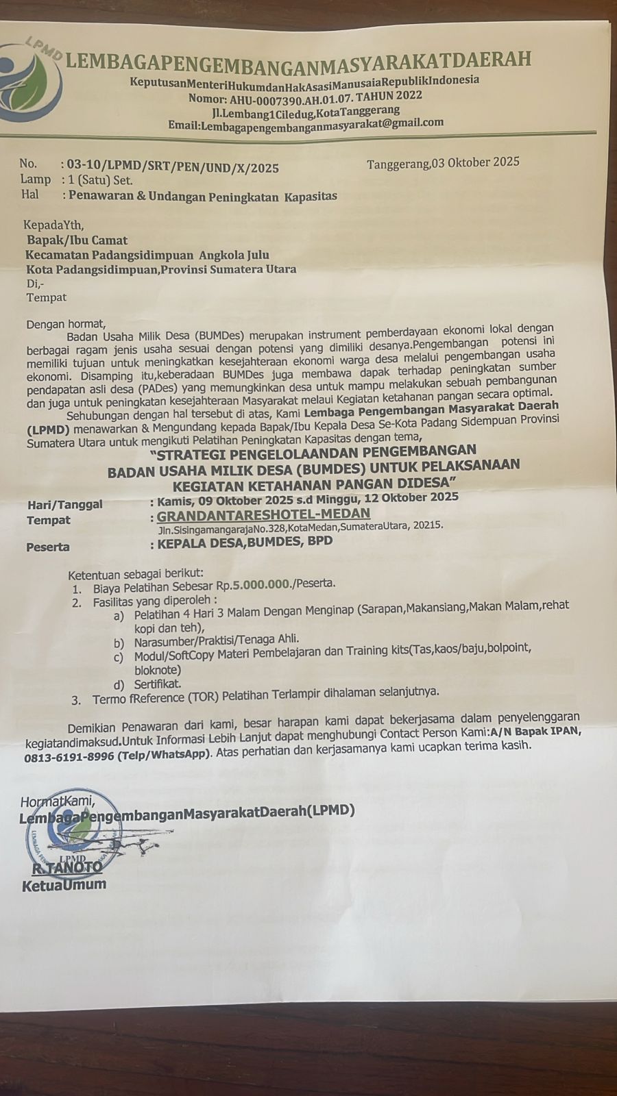 Bagaimana tidak, dari surat undangan yang beredar penyelenggara diketahui bernama Lembaga Pemberdayaan Masyarakat Desa (LPMD) yang berkedudukan di Medan sesuai dengan Surat terdaftar mereka pada Kemenkumham.