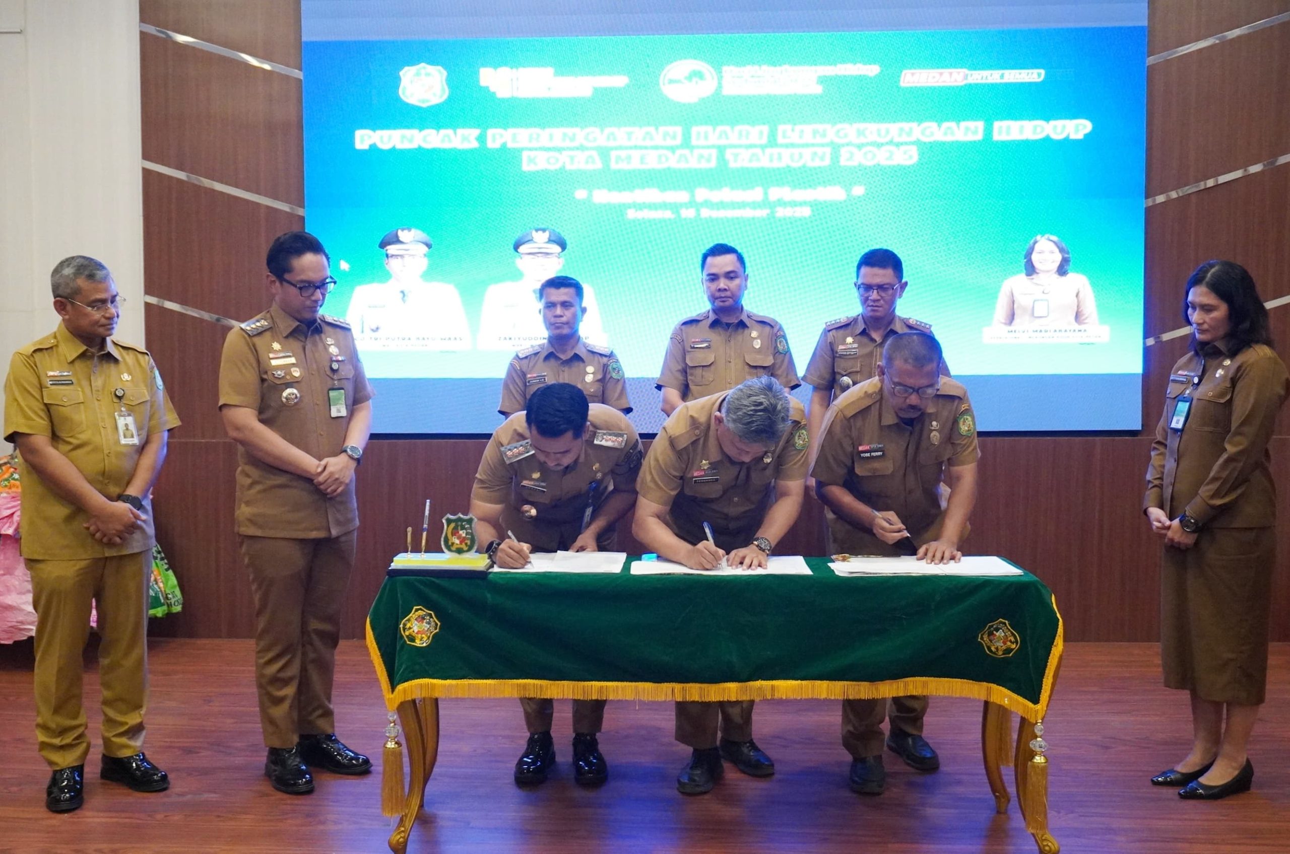 Wali Kota Medan Rico Waas menyaksikan Camat menandatangani kampanyekan pengurangan penggunaan plastik untuk merawat bumi di ruang rapat III, Kantor Wali Kota Medan, Selasa (16/12/25).