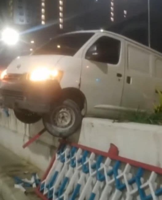 Sebuah mobil minibus Granmax putih viral di media sosial karena nyaris terjatuh ke underpass setelah menabrak pagar pembatas jalan.