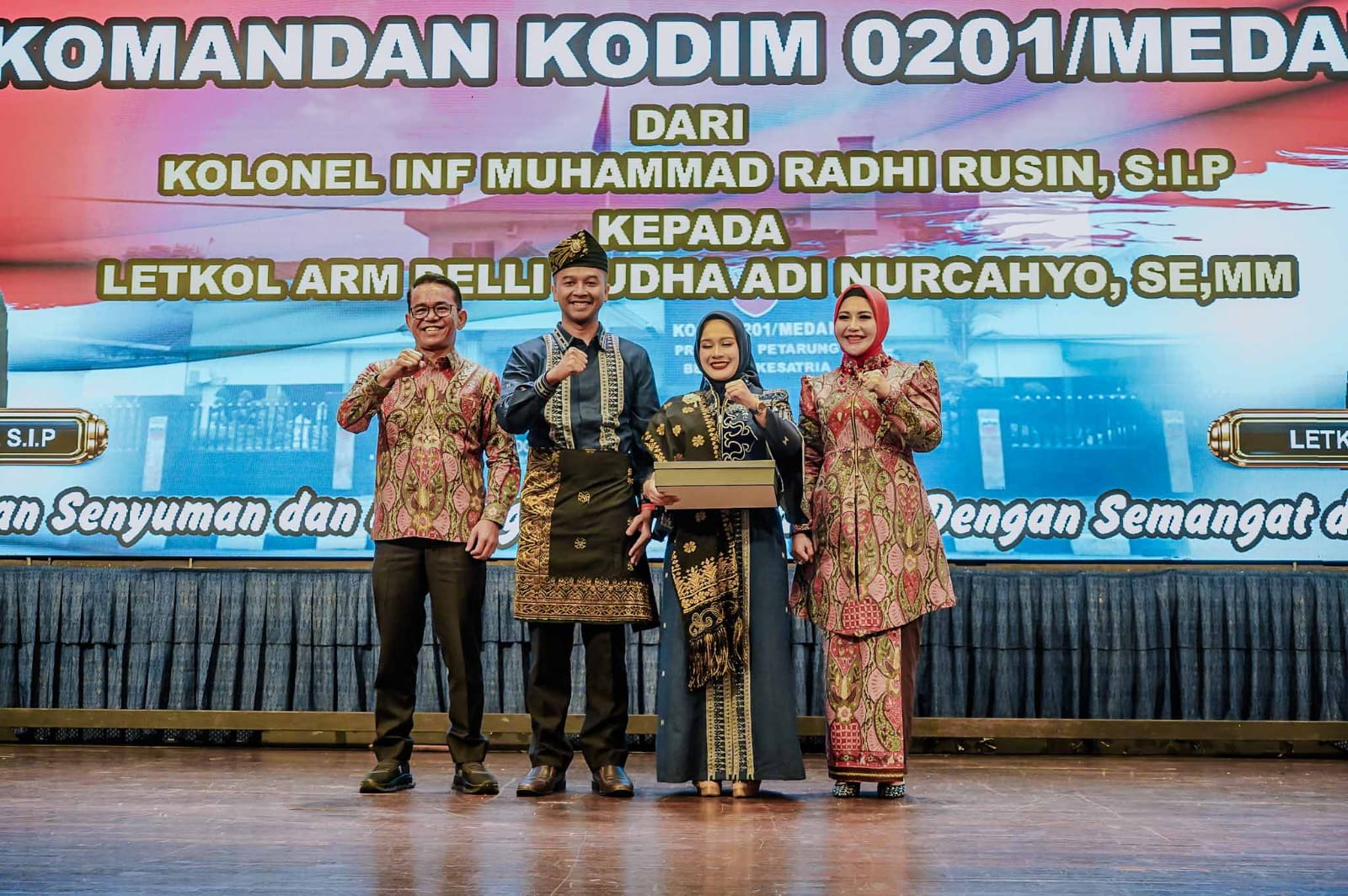 Momen kebersamaan tampak saat Zakiyuddin didampingi istri Martinijal Zakiyuddin Harahap, memakaikan tanjak dan kain songket kepada Dandim 0201/Medan yang baru, Delli Yudha Adi Nurcahyo, beserta istri. Prosesi ini menjadi simbol penerimaan dan harapan akan kesinambungan pengabdian di Kota Medan. Sementara itu, cenderamata juga diserahkan kepada pejabat lama, Muhammad Radhi Rusin, sebagai bentuk penghargaan atas dedikasi selama bertugas.