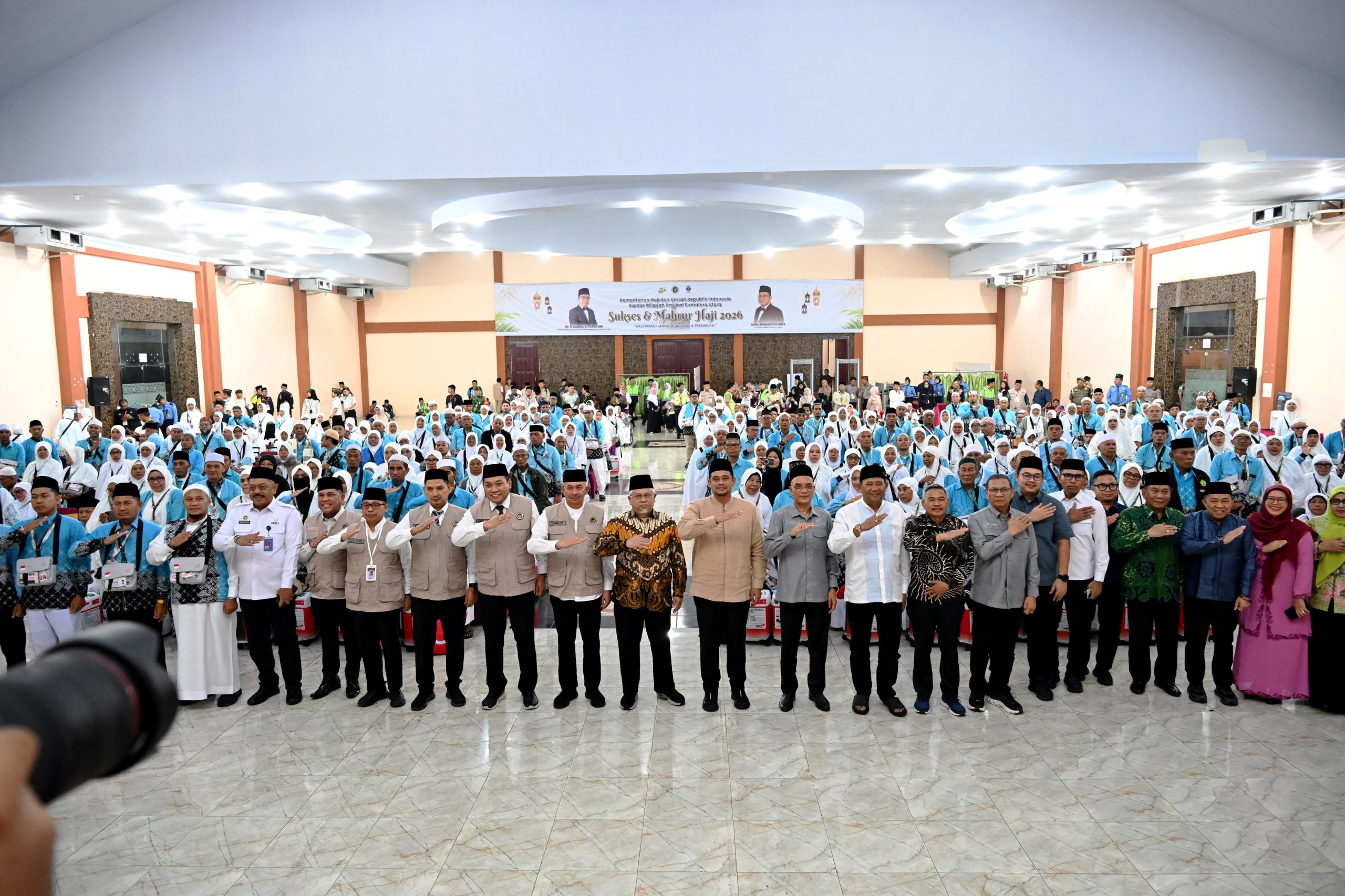 Gubernur Sumut Muhammad Bobby Afif Nasution bersama Ketua Komisi VIII DPR RI Marwan Dasopang, didampingi Penjabat Sekdaprov Sumut Sulaiman Harahap, dan petugas Kementerian Haji Indonesia, beserta Forkopimda, melepas jemaah haji Kloter 2 Embarkasi Medan di Asrama Haji Medan, Jalan AH Nasution, Selasa malam (22/4/2026).
